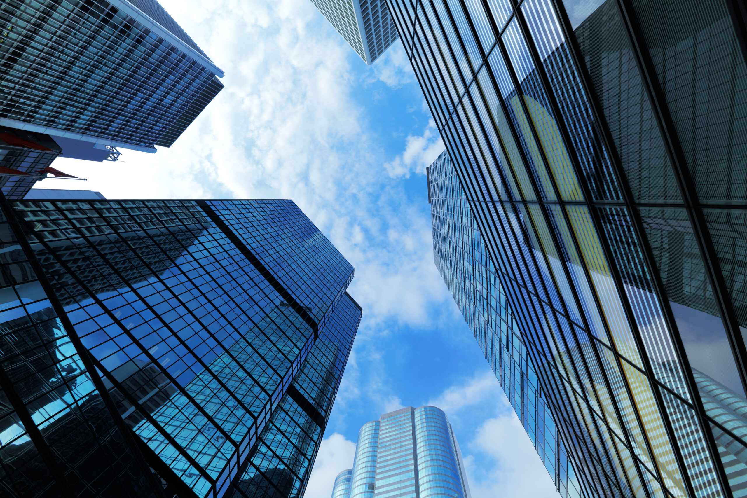 Flat lay top view of outline of house on green background, sustainable living concept.office buildingsGigantic skyscraper from below in Hong Kong Original size is 2560 × 1707 pixels